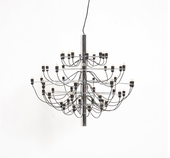 The 2097 chandelier by Flos/Arteluce is an extremely stylish design by Italian Gino Sarfatti (1912-1985) made of high-quality materials. This is the largest version with 50 bulbs.