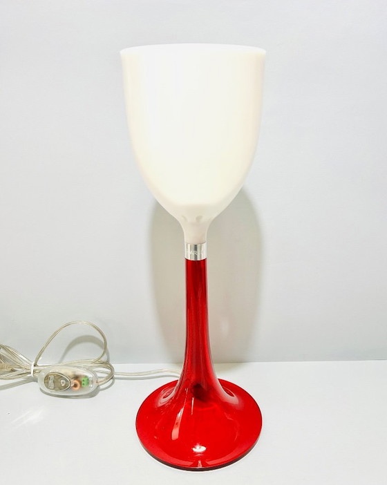 Illuminate your space with the elegant FLOS Miss K table lamp, a masterpiece of modern design. Its striking red base and pristine white shade create a captivating contrast, making it a perfect addition to any contemporary setting.