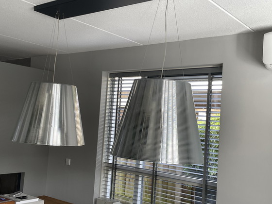 Illuminate your space with the refined elegance of the Flos Tribe S3 set of pendant lamps. This exquisite pair, complete with a sleek ceiling plate, offers a sophisticated touch to any modern interior. The lamps' metallic finish exudes a contemporary charm, making them a perfect addition to both residential and commercial settings.