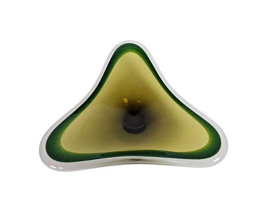 This beautiful Flygsfors Coquille bowl, designed by Paul Kedelv in the 1960s, is a stunning example of Swedish craftsmanship. The bowl exudes elegance with its flowing lines and subtle color combination of green and yellow, surrounded by a transparent glass layer.