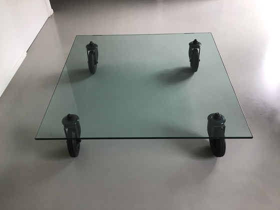 This is a beautiful glass coffee table designed by Gae Aulenti in 1980 for the renowned Italian brand FontanaArte. The table has a slim, transparent glass top supported by four sturdy metal casters, giving it a unique and modern design. Perfect for adding a touch of elegance and sophistication to any living space. Despite a small chip on one corner, the table remains a beautiful and functional piece of design history.