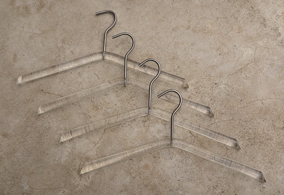 Ai: This set of four 1970s hangers offers a unique combination of style and functionality. Made of durable polycarbonate, these hangers exude a timeless elegance that fits perfectly into a modern or classic wardrobe.