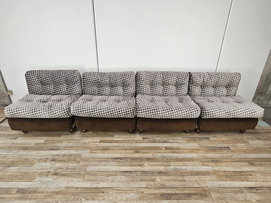The brown seat cushions are original from the period, as are the others that have just been reupholstered with a beautiful checked fabric. Two metal brackets are included to attach two armchairs together.