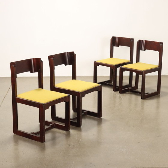 Vintage dining chair set with exotic wood veneer frame and original yellow fabric seat.