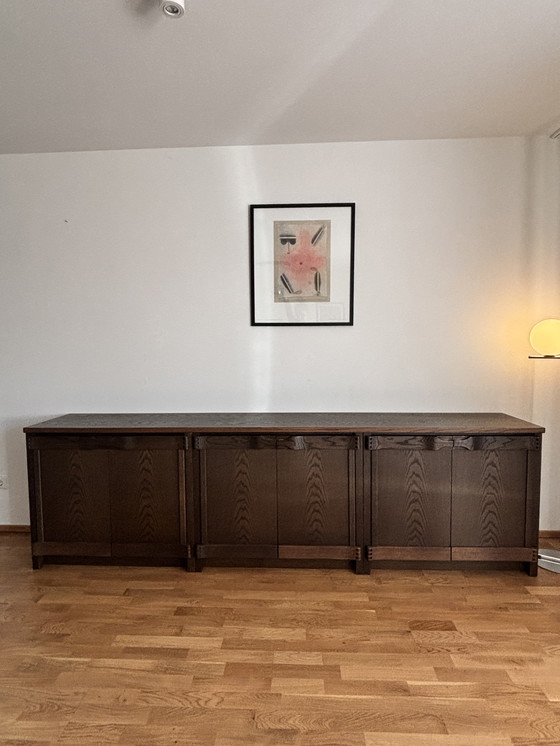 Crafted in dark-stained wood with a bog oak finish, the sideboard impresses with its calm, continuous grain and a clear, timeless design. The construction showcases high-quality craftsmanship with exposed structural elements, typical of Swiss Modernism of this period.