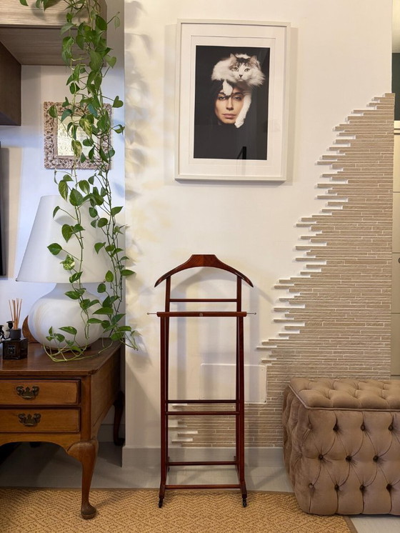 This elegant vintage valet stand, crafted in Italy, showcases timeless design and functionality. Made from high-quality wood, it features a classic structure designed to hold clothing and accessories with style. The stand bears visible signs of wear and age, adding character and authenticity to its vintage charm. A perfect piece for those who appreciate retro aesthetics and practical design. Ideal for bedrooms, dressing areas, or entryways