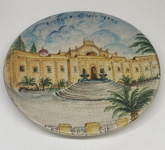 Hand-painted decorative plate from the Soldano Brothers (Fratelli Soldano) factory in Sciacca, Sicily, depicting the thermal baths of Sciacca with the inscription "Ricordo di Sciacca terme" or "Souvenir of the thermal baths of Sciacca." This ceramic piece, entirely hand-painted, depicts the front of the famous thermal center of Sciacca, known for its therapeutic virtues, now closed. It is then glazed entirely with a crackle effect. The design is inscribed "Ricordo di Sciacca Terme" as well as the signature "A. Soldano" for Alberto Soldano, who opened the factory with his twin brother in 1973. The back of the piece features the signature "F.lli Soldano Sciacca" as well as a metal hanging wire. The factory, still active today, is a point of interest for travelers who wish to learn the qualities of Italian majolica.