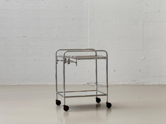 A rare and exceptionally well-designed collector's item from 1940s France: an Art Deco bar cart that transcends the classic function of a serving trolley. The clean, elegant lines of the chrome-plated construction combine with refined, functional details to create an object that unites design and use at the highest level.