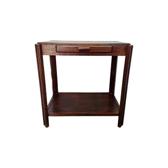 French Art Deco table with drawer, dating from circa 1930. A lovely Art Deco table model with a drawer and an extra shelf between the legs. Made of solid wood and finished with a dark stain. Otherwise in sturdy condition with very light signs of use.