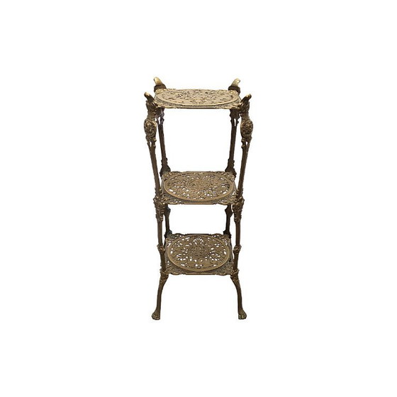French Art Nouveau-style brass plant stand from the 1960s/70s. This beautiful and decorative three-tiered plant stand is perfect for displaying various plants or other decorative objects. It is made of brass and has undergone periodic restorations, but is otherwise in good condition.