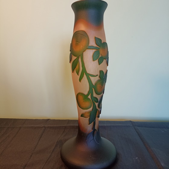 Beautiful hand-blown cameo glass vase from the renowned French glassworks Vianne. The vase is crafted in the iconic Art Nouveau style of Gallé and Schneider, featuring a detailed relief decoration of plums/fruit on branches.