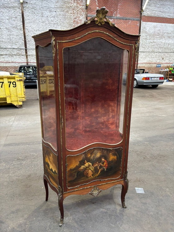 Beautiful classic display cabinet in Louis XV / French style. The cabinet features curved glass panels, graceful bronze ornaments, and elegant curved legs.
