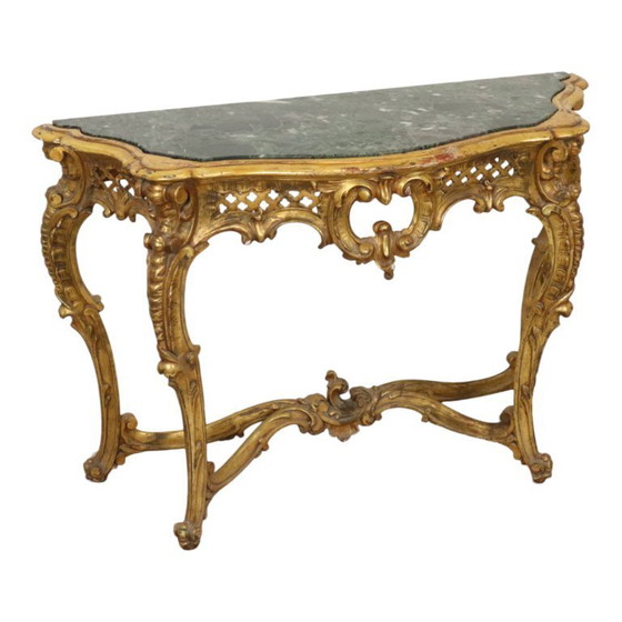 Gracious and elegant console, richly decorated with acanthus leaves and motifs, entirely in a classical style; the object bears a beautiful patina of age and use. The green marble top is supported by opposing C-shaped legs, connected by a centrally carved cross piece.
