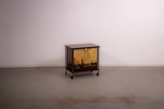 French bar cabinet made from Mahogany and Brass in the 1970s. With a picture depicting tall ships at sea on the door.