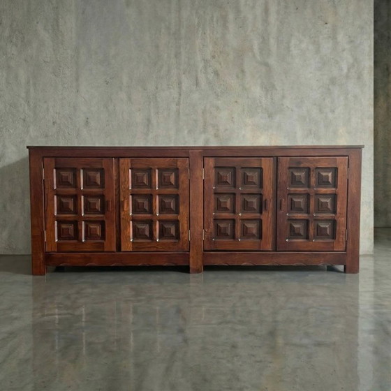 This French solid oak sideboard translates Brutalist geometry into a warm, deeply tactile domestic object. Defined by a rhythmic 3x2 grid of raised panels across its four doors, the carved facade captures light to create a constant interplay of shadow and organic texture.