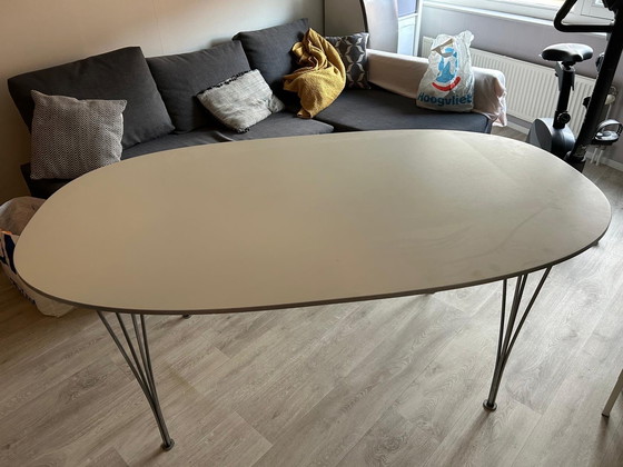 The Fritz Hansen Superellips table, designed by Piet Hein and Bruno Mathsson, is a stunning example of Mid Century Modern elegance. With its sleek white tabletop and elegant silver metal legs, this table combines durability with aesthetic appeal. The unique Superellips shape offers ample dining space while maintaining a graceful silhouette. A true collector's item, this table promises to elevate any dining experience.