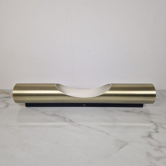 This sculptural light features a cylindrical brass-toned metal body with a softly curved central diffuser, creating a warm and atmospheric light distribution.