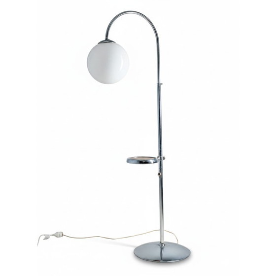The height-adjustable stem and movable shelf make this lamp both visually distinctive and highly functional. The opaline glass shade provides soft, ambient light, while the chrome construction reflects the era’s focus on modern materials and industrial elegance. A rare and authentic piece suitable for interiors inspired by Functionalism, Bauhaus, or Art Deco.