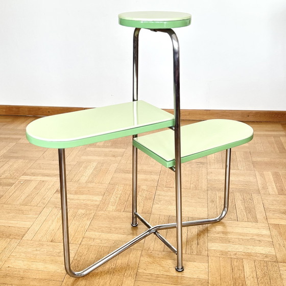 Functionalist plant stand, according to the Vichr catalogue - No. 1069. Made by Vichr & Spol., Prague, marked. Height 85 cm, upper round plate diameter 23 cm, lower plates measuring 23 x 47 cm - renovated. Original greenish glass removable cover plates in excellent condition available.