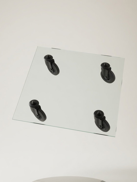 Experience the timeless elegance of the Gae Aulenti Fontana Arte "Tavolo Con Ruote". This iconic design combines functionality with a refined aesthetic, perfect for the modern living space. The glass tabletop rests on sturdy metal wheels, adding unique mobility and style to your interior.
