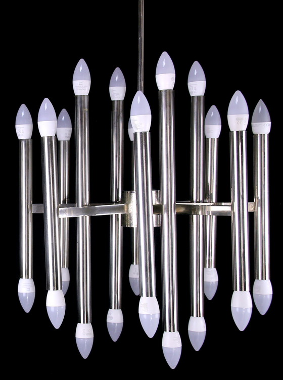 Elegant and famous Gaetano Sciolari Chrome Chandelier with twenty four lights. Easily recognizable by his well known design for rectangular shape arms holding two lights each, up and down, ( twelve arms). Made in Italy during the Mid-Century period, in "Space-Age" Style. In working condition, wired for European and International Standards, both 120V and 250V, also with disable LED Please view our large collection of French, Italian and European lighting fixtures on our boutique, and we have hundreds of antique and vintage lighting fixtures that have yet to be listed on whoppah. If you need a specific designer model, please ask us, we might have it in our warehouse
