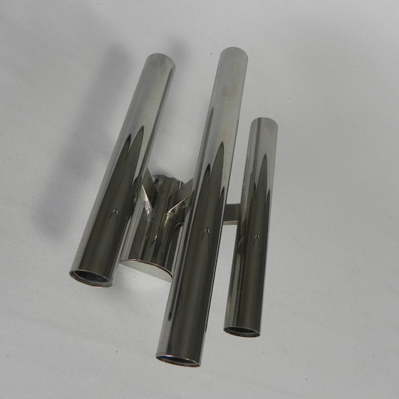 This striking wall lamp consists of two chrome-plated tubes (Ø 3 cm, 22 cm long) and one tube (Ø 3 cm, 30 cm long).