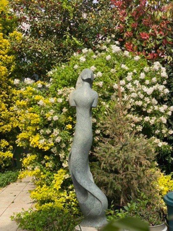 This beautiful garden statue, an African sculpture from the late nineties, adds a touch of elegance and culture to any garden. Crafted from durable stone, the statue exudes a timeless beauty that blends perfectly with the natural surroundings.