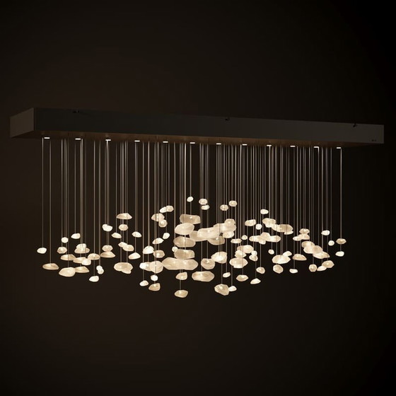This glass crystal chandelier Genius Grande No.1 is a high-end spectacle of the highest order. With an extremely interesting shape, color and appearance, it has been hand-formed by highly skilled designers. This spectacular, crystal chandelier in an unusual, beautiful shape, is executed with real rock crystal. Rock crystal is a gemstone created entirely by nature. A natural and real mineral with many properties. Extremely special and picturesque. It merges perfectly with light, receives it and then returns it in the form of a very subtle glow. A beautiful, natural product that creates a special symbiosis with light. GENIUS GRANDE is a truly impressive and modern chandelier composed of many individual rhinestones of different sizes. Each stone is suspended from a thin cord twisted with yarn. The composition of the chandelier is made so that the crystals can be hung freely and organically in the room. This chandelier is the inspiration behind the classic chandeliers. A classic lamp in a modern version. GENIUS GRANDE is a sculptural lamp, where the light of the chandelier comes from the inside of the crystal. Each stone is characterized by an organic form, each in a different shape, size or translucency. Some stones are perfectly smooth and resemble pure ice. Others, on the other hand, are dull and mysterious. Their internal structure affects the way light is transformed from the crystal. The stones suspended in the chandelier's composition shine like the starry sky. Some shine stronger, others fainter. Some are larger, some are smaller. This way of composing makes the chandelier a sculpture that should influence emotions and enrich the interior. The rock crystal used in the product is a genuine gemstone that has been mined in Europe for centuries. A natural product with all the characteristics and properties of a rift. The ancient Greeks claimed it was a stone sent by the gods. A truly authentic product far from imitation and mediocrity. Sustainably extracted, respecting European laws and quality standards. Processed in a minimal way that emphasizes the nature of the material. For lovers of nature and true beauty.
