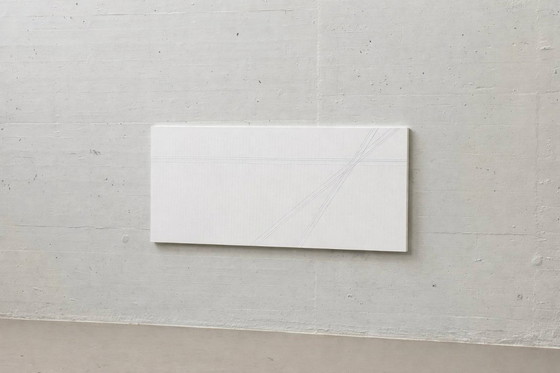 This composition, executed in acrylic on wood, derives its power from a subtle order of finely crafted vertical lines that extend across the entire surface, lending the work a calm, rhythmic structure. This regular linearity is punctuated by diagonally running, slightly raised lines that intersect on the right side, creating a dynamic tension. The interplay of light and shadow is particularly captivating: the relief-like texture causes the lines to appear differently depending on the viewing angle, creating a very subtle, almost graphic depth effect. The reduced color palette of white and delicate shades of gray and blue underscores the constructive character and clearly references the tradition of Concrete Art. The work appears precise, serene, and simultaneously dynamic—a typical characteristic of Forster's exploration of space, structure, and perception. A signed adhesive label, R. Forster 92, is affixed to the reverse, confirming the date.