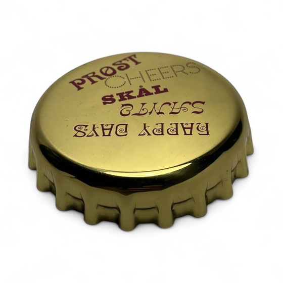 Georg Jensen (Denmark, 1981) - rare, large XL bottle opener in crown cork design in a noble gold look, decorated with "Prost - Cheers - Skål - Santé - Happy Days".