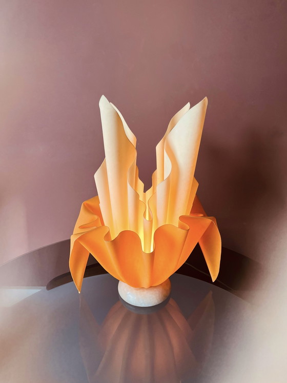 Wow, what a unique and beautiful design, this lamp by Georgia Jacob from the 70s/80s. It looks like an elegant faux-facade model, especially with the combination of white and orange colors. This creates a very special, warm, and atmospheric light. The base is made of a beautiful piece of marble.
