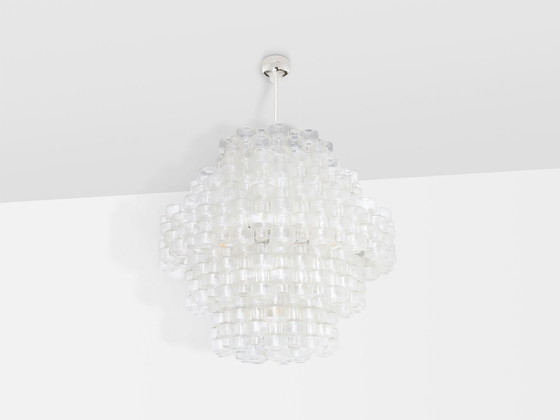 A rare extra large Festival chandelier designed by Gert Nyström and produced in Sweden in the early 1960s by Fagerhults with glass from Orrefors. The chandelier is made in five tiers, with a total of 144 glass elements, and 30 bulb sockets. Each tier features an aluminum rack loaded with flexible plastic fittings that hold the Orrefors crystal glass cylinders. The intricate crystal glass elements, with 30 bulbs lighting them up, produce a sophisticated and diffused light, fostering a welcoming ambiance in any interior. This chandelier has been fully restored and electrified, and is found in a beautiful condition, ready to enlighten any space.