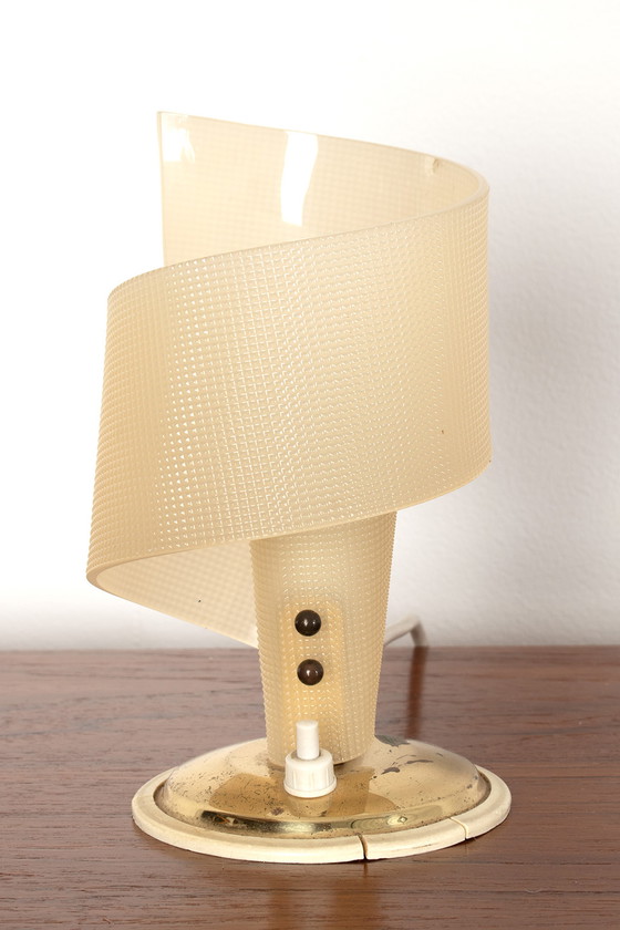 This cute lamp by Geru from the 1950s gives beautiful atmospheric light.The shade is made of plastic and the base of brass (some patina).In good vintage condition. Measurements: H. 18 cm; Ø 12 cm.