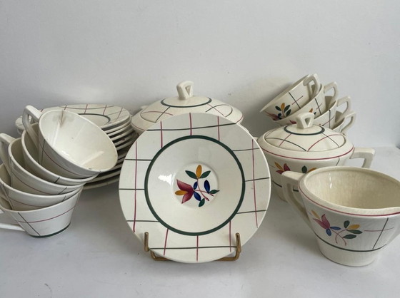 It comprises 10 cups with saucers, a coffee or teapot, a sugar bowl, and a milk jug. The set is in very good condition considering its age: only a few cups show minor imperfections, visible in the photos.