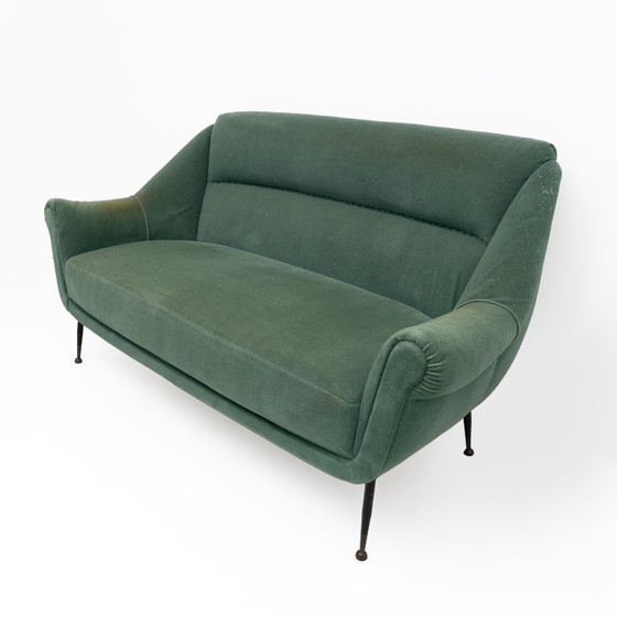 Sofa designed by Gigi Radice for Minotti. Made with a solid wood frame and green velvet upholstery, brass legs, and black lacquered metal. It is recommended to replace the worn upholstery, as shown in the photo.