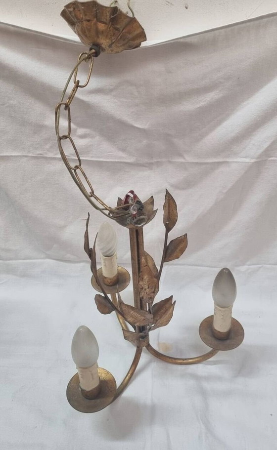 Italian-made 3-light gilded iron chandelier from the 1970s, decorated with leaves.