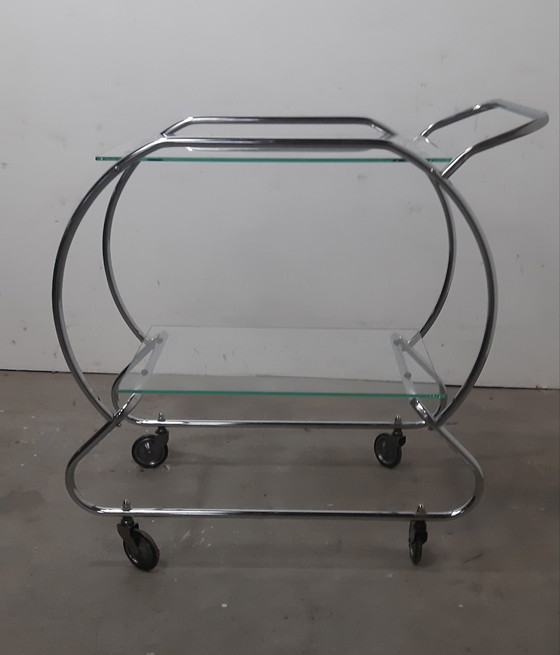 This beautiful Gispen serving trolley from the 1930s is a paragon of elegance and functionality. With its refined Art Deco style, it adds a touch of timeless class to any room. The chrome-plated aluminum frame and glass shelves create a modern look that fits perfectly in both classic and contemporary interiors.