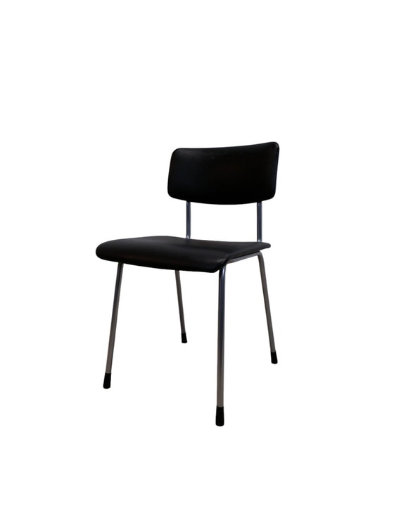 Tube chair 1231, designed by Het Ontwerpbureau N.V. Gispen and produced by Gispen, 1960s. Black skai upholstery and original high "socks" around the legs. The back of the frame can be used as a handle. HxWxD= 79cm x 44cm x 50cm, seat height 48cm.