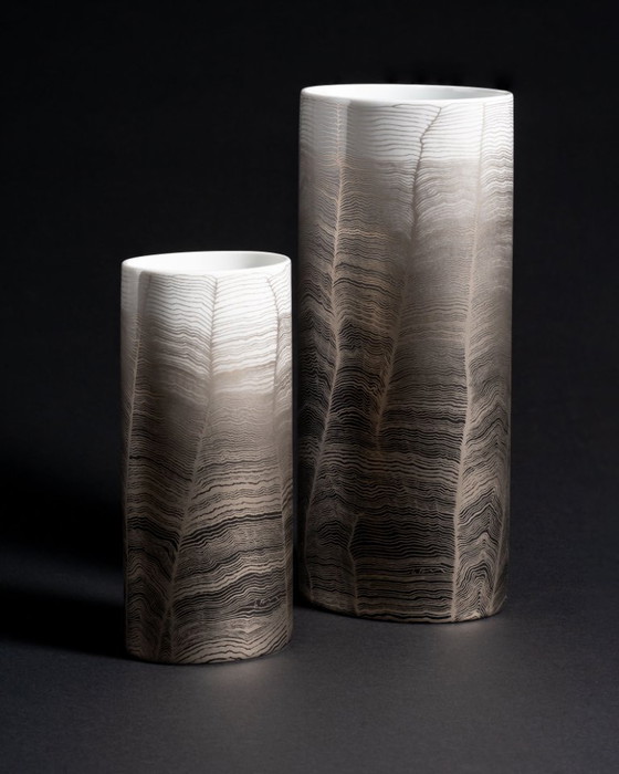 The taller vase (model 3085/28) elongates the form, emphasizing verticality and the flowing movement of the surface pattern.
