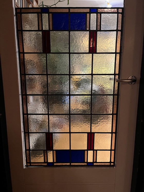 This exquisite stained glass window is a testament to the timeless beauty of Art Deco design. The vibrant hues of blue and red are elegantly framed by a sturdy metal lattice, creating a captivating interplay of color and light that will enhance any space with its artistic charm.