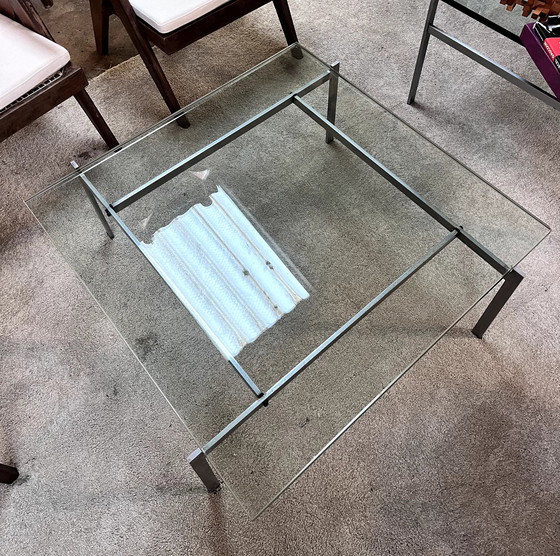 Vintage glass coffee table by Poul Kjaerholm, 1st Christensen edition. Model PK61, 1960. Some damage to the glass (see photos). Dimensions : W 83 x D 83 x H 32 cm