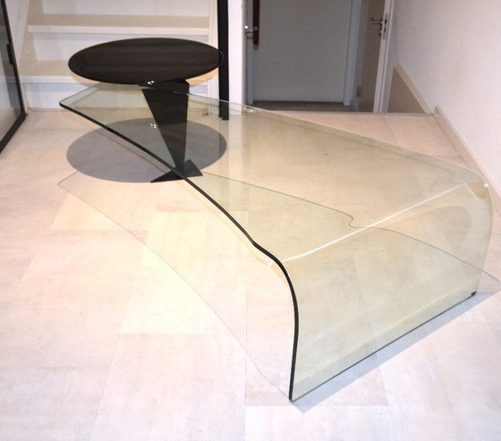 Catellan Italia coffee table, Haley model, from 1989. The transparent, asymmetrically shaped glass combined with the black round top and sleek metal base creates an airy and stylish look. The black top can be rotated inward and outward thanks to an off-center mounting, adding a playful touch to the table.