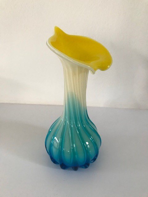 Glass designer vase in blue-yellow-white, Murano style, arum calyx. Height 20 cm. Diameter bottom 7 cm. In perfect condition.