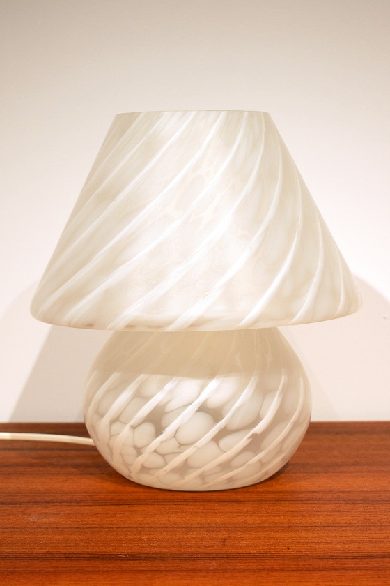 Glass mushroom table lamp. The glass has a beautiful pattern, creating a very atmospheric light. In good vintage condition.