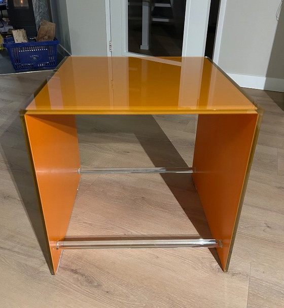 Stylish and modern side table by Bert Plantagie, made of high-quality glass in a striking orange hue. Perfect as an accent piece in any room, this table offers both functionality and a pop of color. A must-have for lovers of modern design.