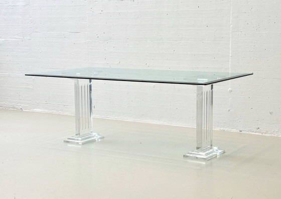 The tabletop consists of a clear, thick glass panel with polished edges and rests on two striking, column-like legs made of acrylic glass.