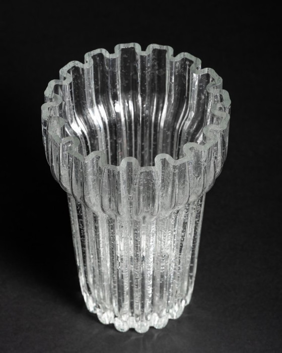 The vase reflects the geometric modernism of West German glass from the 1960s–70s. The vertical ribbing and fluted rim create a structured architectural rhythm reminiscent of Scandinavian and Italian glass design of the same period, while the thick pressed glass gives the object a strong optical depth that interacts beautifully with light.