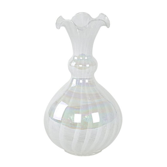 A delicate, hand-made Murano-style artistic glass vase with a slender neck finished with a wavy collar. The body is decorated with a subtle pattern of spiral white stripes and striking pearlescent iridescence, which shimmers with many colours depending on the angle of light. Thanks to its elegant form and luminous finish, it can serve as both a decorative accent in a modern interior and a stylish addition to a vintage-inspired arrangement.