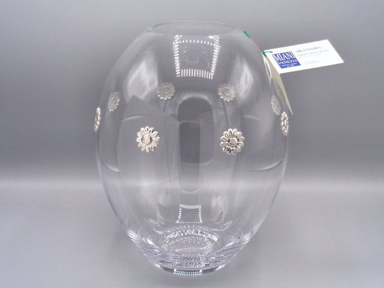 Blown glass vase with 8 hand-embossed 925 solid silver flowers - weight 839 grams - height 25 cm - width 20 cm - the silver flowers are all hallmarked with the 193VE state mark and 925 title - handcrafted in the years 2010/2020 by Argenteria PG-MIANI of Venice - warranty included - shipping via express courier with tracking - new, never used