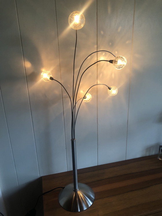 Ball lamp by Original Dutch brokerage Boxford Holland /Bouvrie. The globes are made of thick spiked glass. The lamp has a stepless dimmer allowing you to carefully adjust the desired atmosphere. The nail spheres sit on a steel wire that is bendable so you can model the spheres yourself in the desired position and shape. The lamp can thus take on a new appearance every time. Designed by Jan des Bouvrie in the 1990s. Separate label, you can place on the base if desired. Dimensions: height about 68 cm x diameter of the foot about 15 cm The height of the foot is about 4 cm. Weight is about 2 kg Shipping is possible. Carefully packed in a sturdy box and bubble wrap.